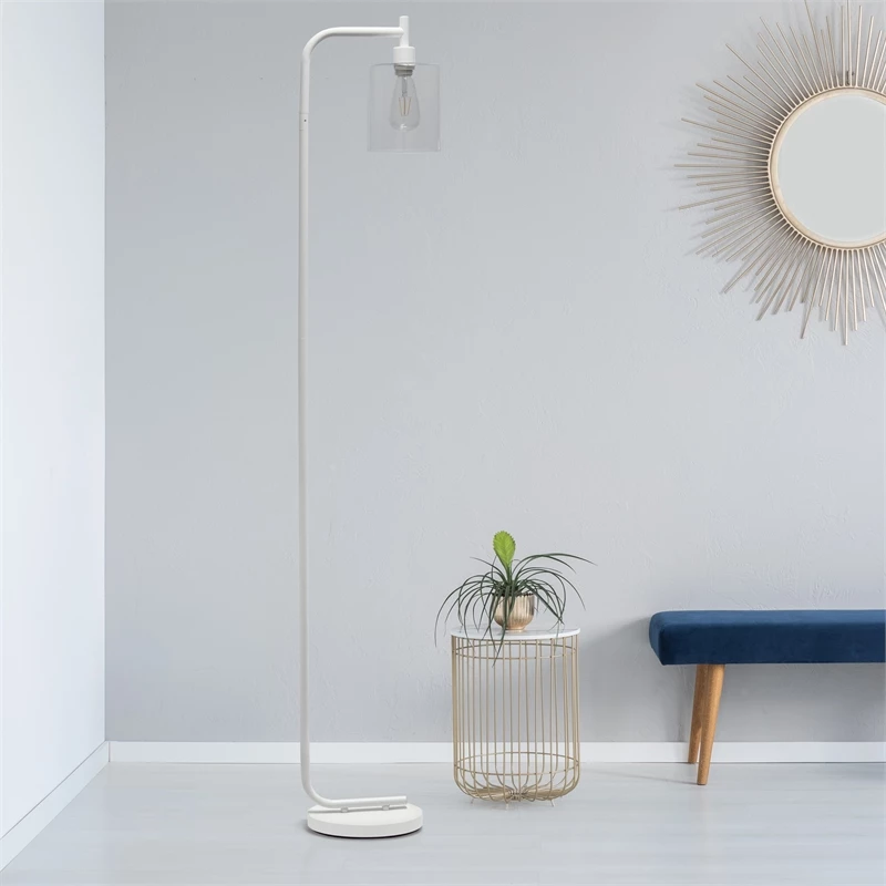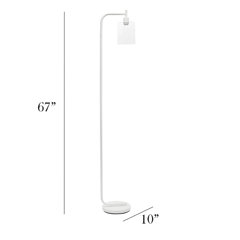 The perfect floor lamp to add a modest, refined look to any room! The iron base and curved arm are accented with a simple glass shade for a sophisticated touch. Perfect for foyers, bedrooms, living rooms or even offices! **HELPFUL TIP: To get the complete industrial look, we recommend using a decorative Edison/Vintage bulb (not included). **