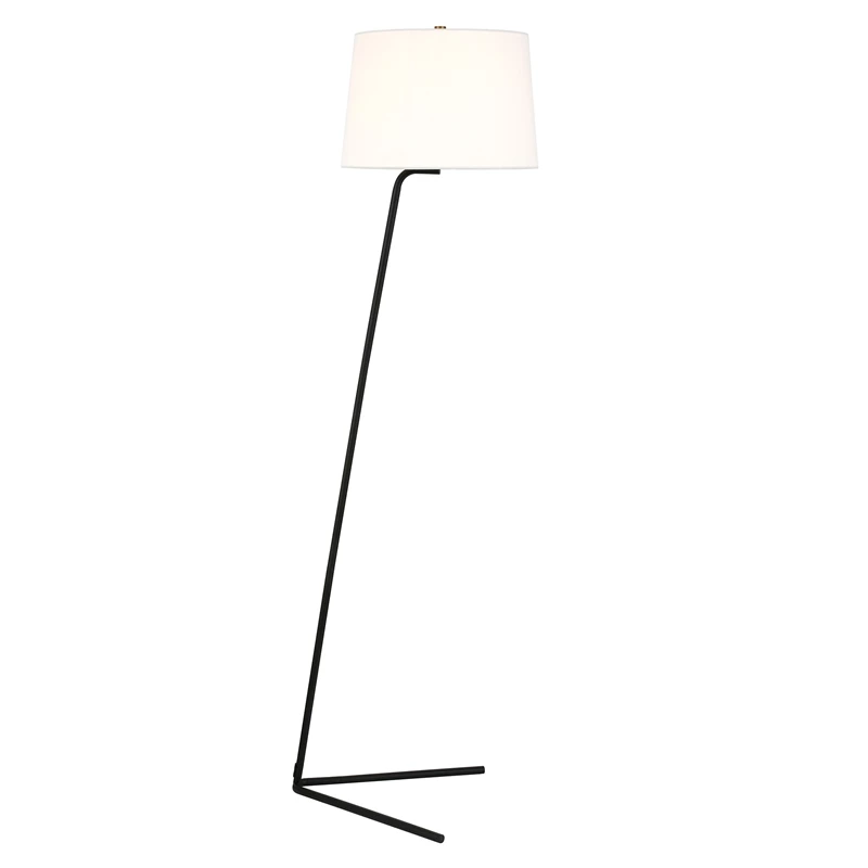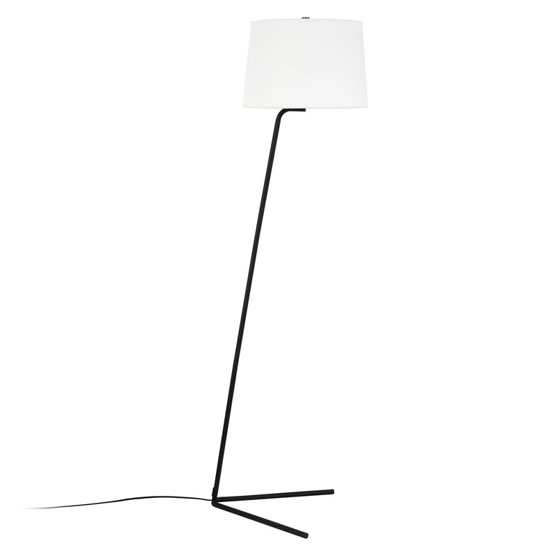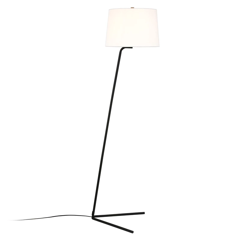 This slightly arced floor lamp features a unique minimal metal base in brass, nickel, or blackened bronze finishes to match your current decor, and a clean white linen shade in a tapered drum shape. A modern piece of mid century inspired design to add style in the corner of your living room, bedroom, or office.