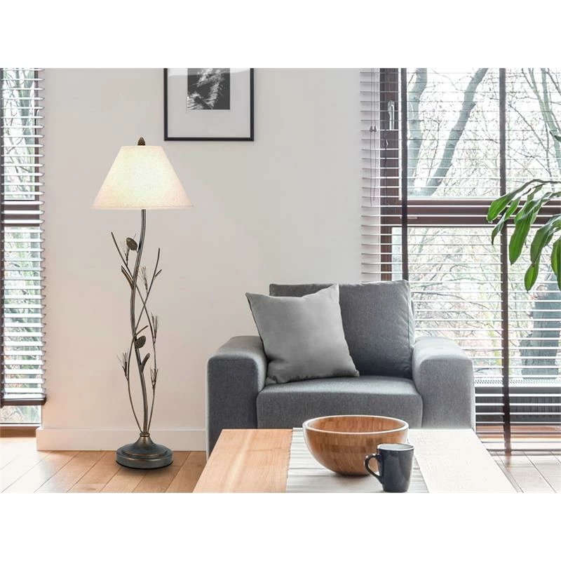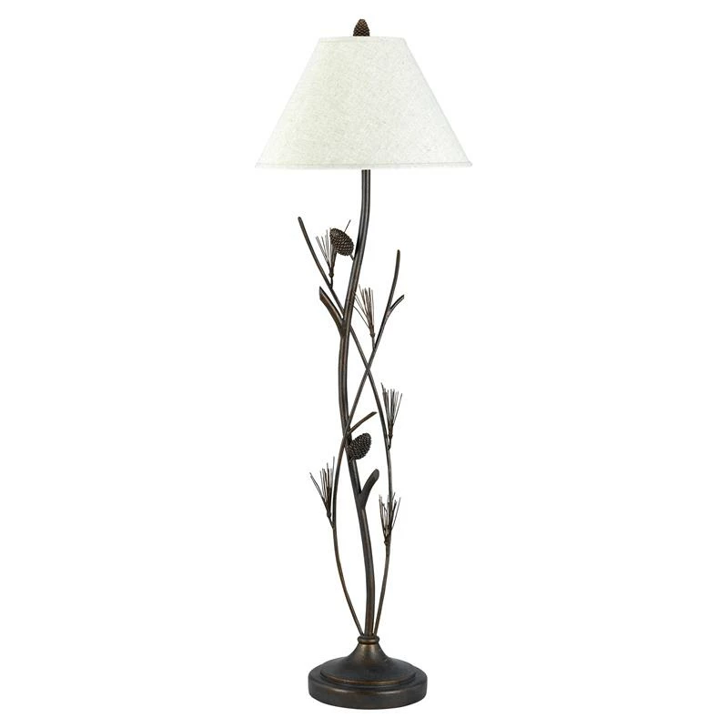 Pine twig floor lamp in a rust finish. It includes a gray white fabric shade.