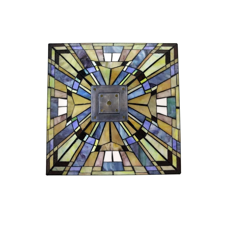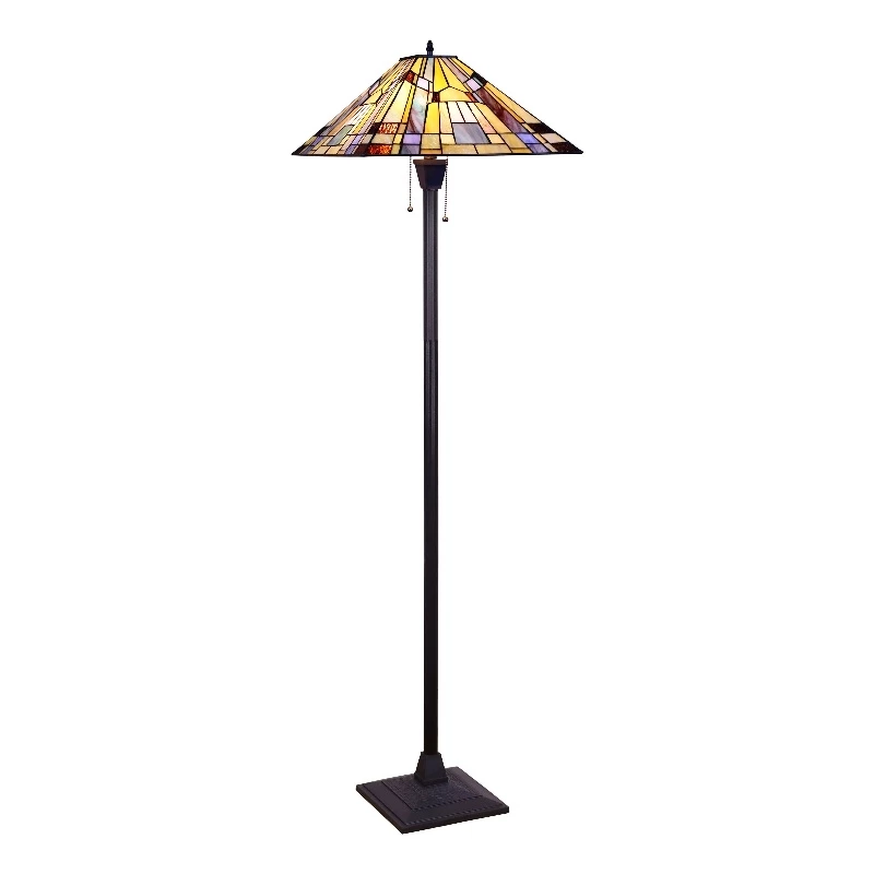 Kinsey is a beautiful, stained glass floor lamp in a traditional Mission style, featuring a blackish bronze base and 2 pull chains switches. This lamp would be perfect in a bedroom, living room, and dining room. The shade is hand-crafted, using the same methods developed by Louis Comfort in the early 1900’s. This process entails using 232 hand cut stained art glass pieces, each wrapped in fine copper foil and soldered together at extremely high temperatures to form each unique piece. Exact size to the nearest inch may vary, and exact color of each glass piece may vary due to each piece being hand crafted. First image is with the light shining through, second image is with no light. Dry listed and recommended for an indoor setting.