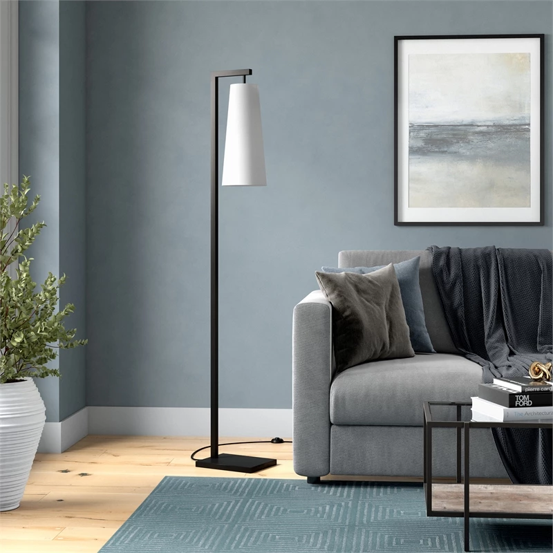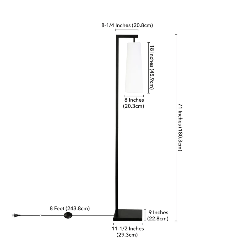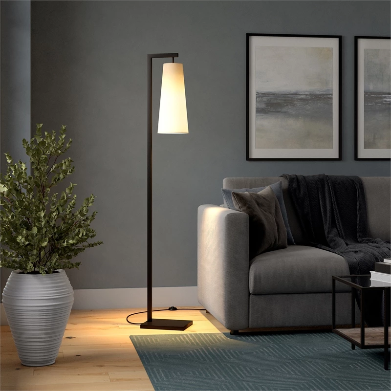 Bring an updated Art Deco feel to any room with the eye-catching angles and curves of this retro-inspired but thoroughly modern floor lamp. The gently tapered elongated cone shade in crisp linen casts the perfect amount of ambient light throughout your space. The soft shape of the shade is offset by the angular geometry of its base, creating a contrast that makes a style statement in your bedroom, living room, or den.