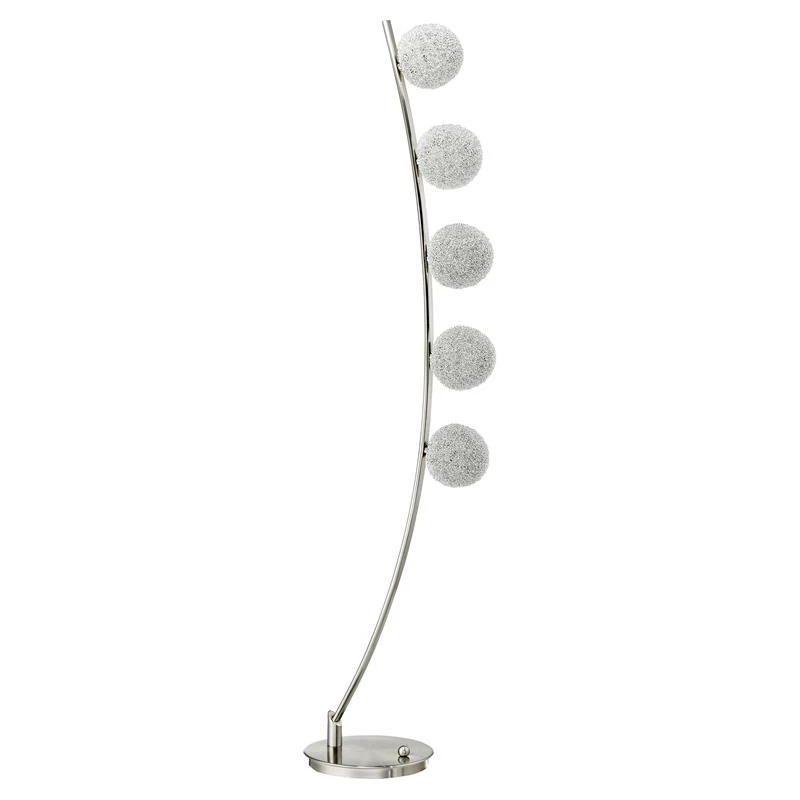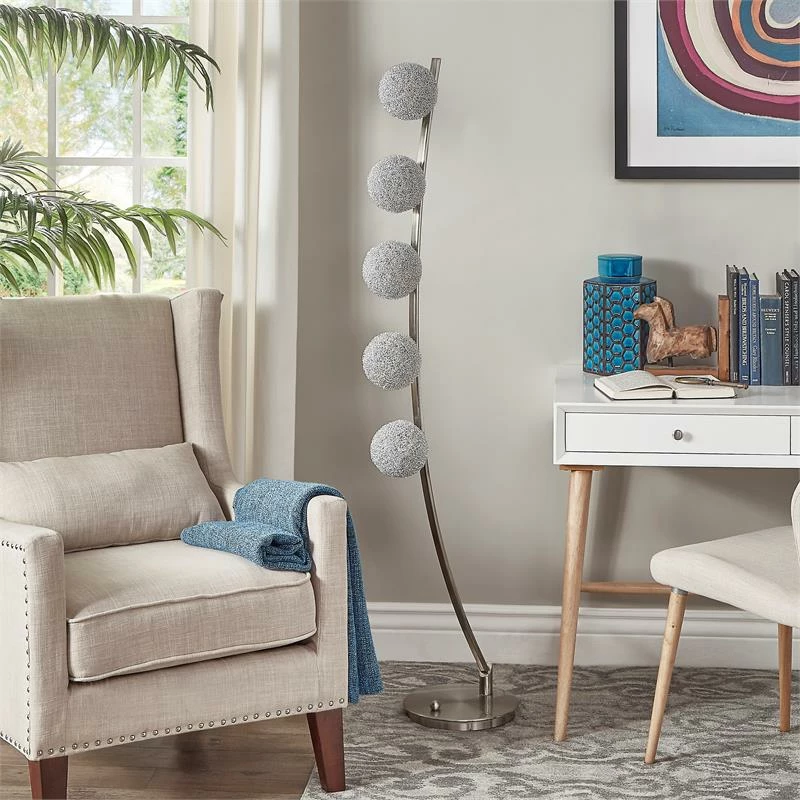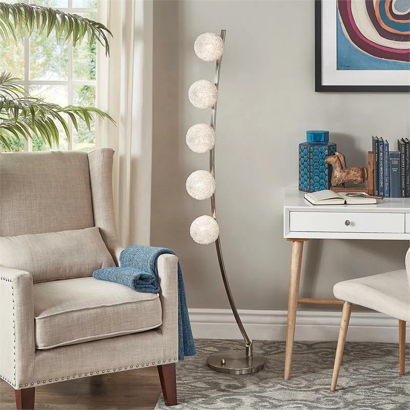 The floating orbital orbs accent lighting floor lamp gravity defying design features five aluminum wrapped sparkling orbs suspended mid-air, arranged in orbital order on an elegant curved stand, illuminating warm white light rays. The piece is beautifully crafted using high quality satin nickel finish metal. Great accent lighting that can enhance the surrounding ambiance, perfect for a night light, or a mood light to brighten up any room.
