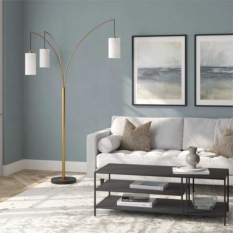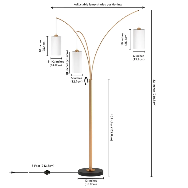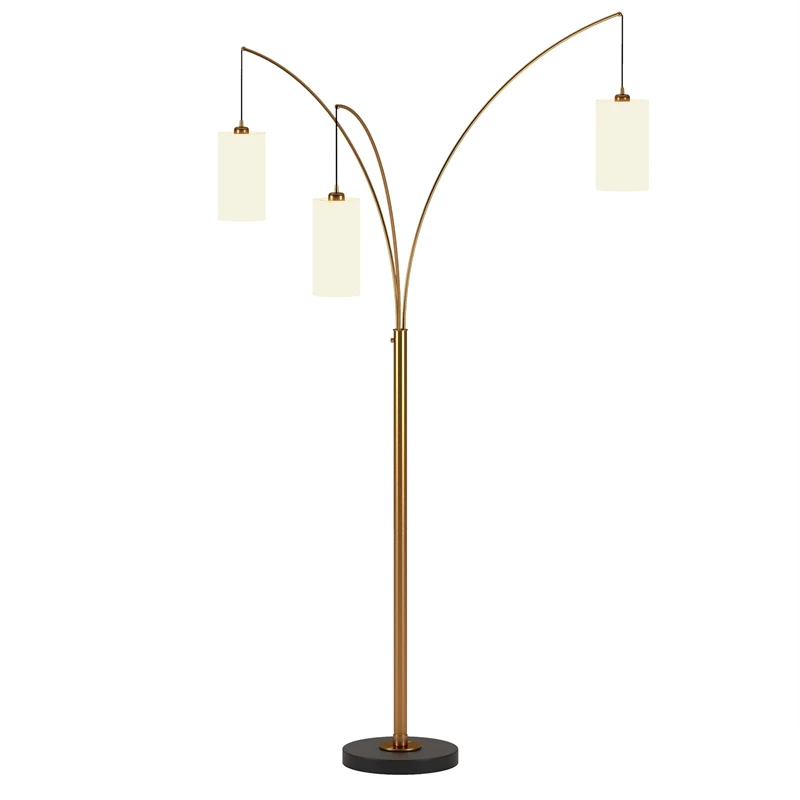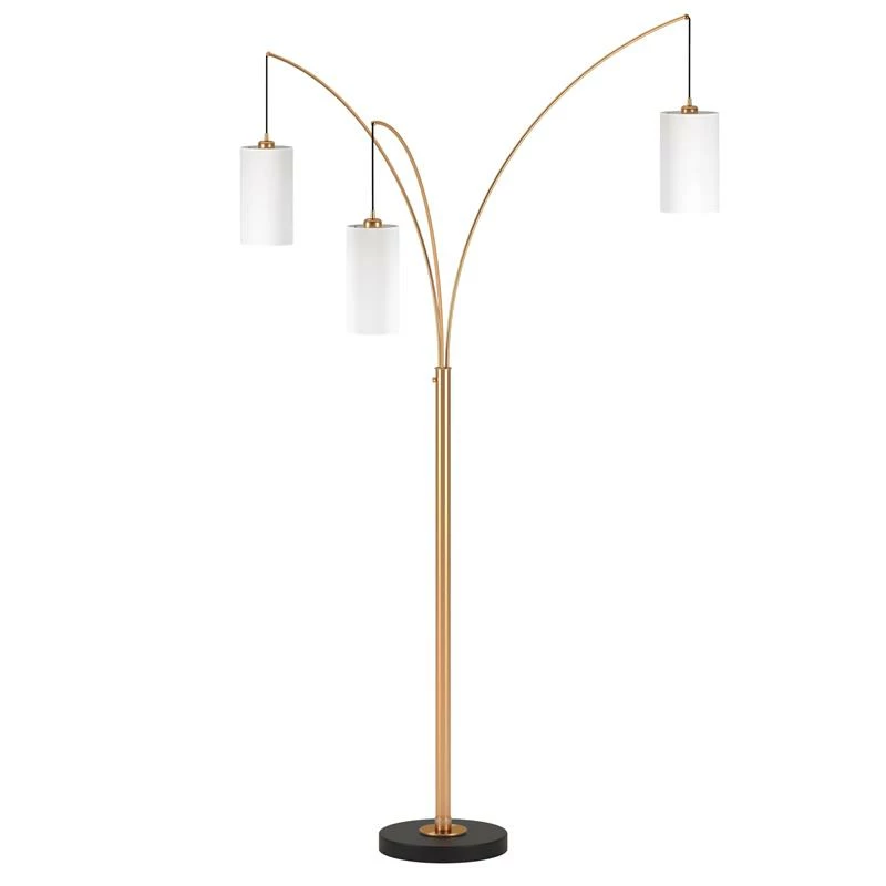 Create open concept design with this unique three-light floor lamp. The sleek metallic finish enhances its arched silhouette, offering a chic complement to contemporary decor. Three fabric drum shades in varying diameters are suspended from the adjustable arms, creating an intriguing pendant effect and allowing you to customize your lighting in any room.