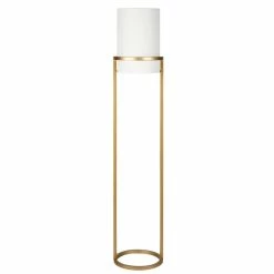 This industrial metal glam floor lamp shines in any space. Simple yet chic, this fixture lights small to large spaces with ease. The inset drum shade in crisp linen mimics the cylindrical base, while the dual support poles create a light and airy feel.