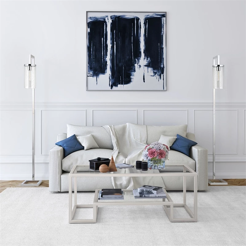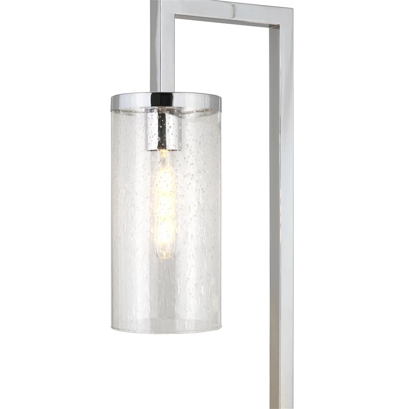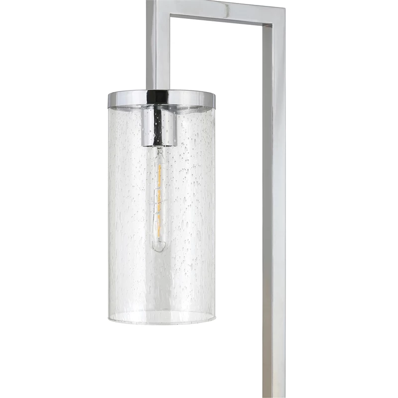 Modern farmhouse chic with a hint of mid-century style will make your home’s living room, bedroom, dining room, or office stand out. The contemporary blackened bronze, brass, or nickel finish that’s been applied by hand to this floor lamp is eye catching, and the seeded glass, clear glass or milk glass downward facing lamp shade will add elegence as it illuminates.