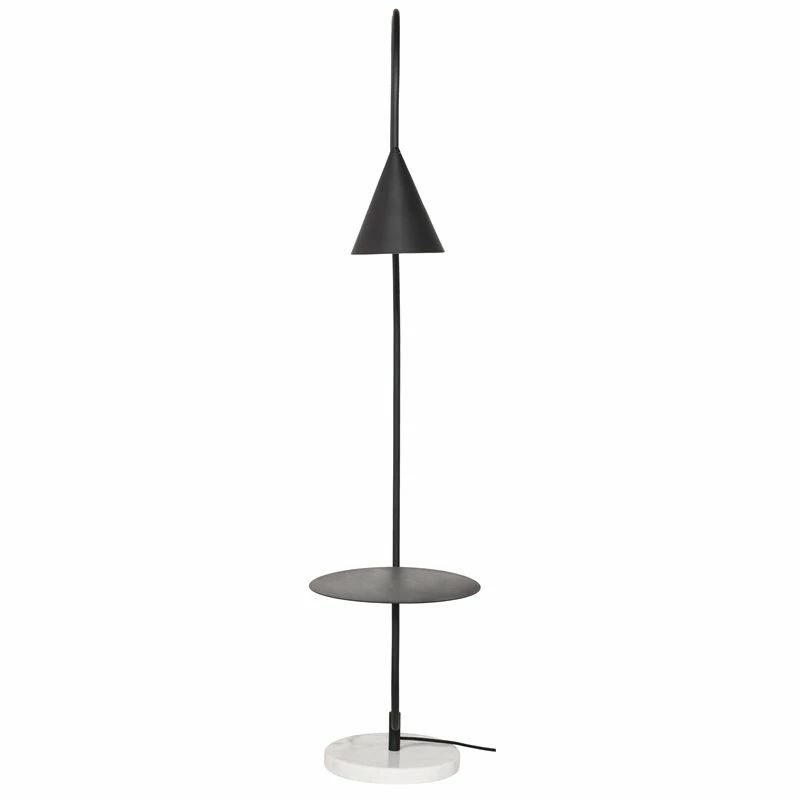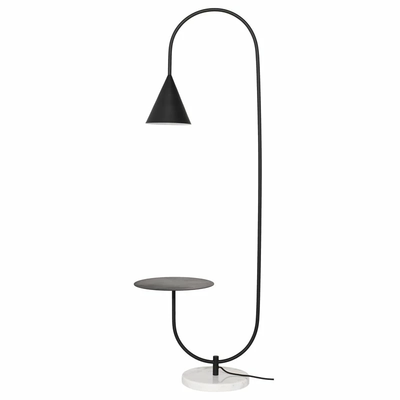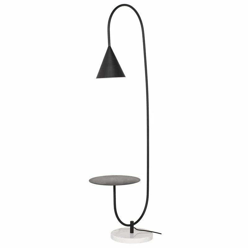 The Arnold floor light is the essence of sculpture as form and function. Set upon a round white marble base the Arnold’s brilliantly designed matte black curvilinear frame with peaked shade is at once a floor light and circular side table.