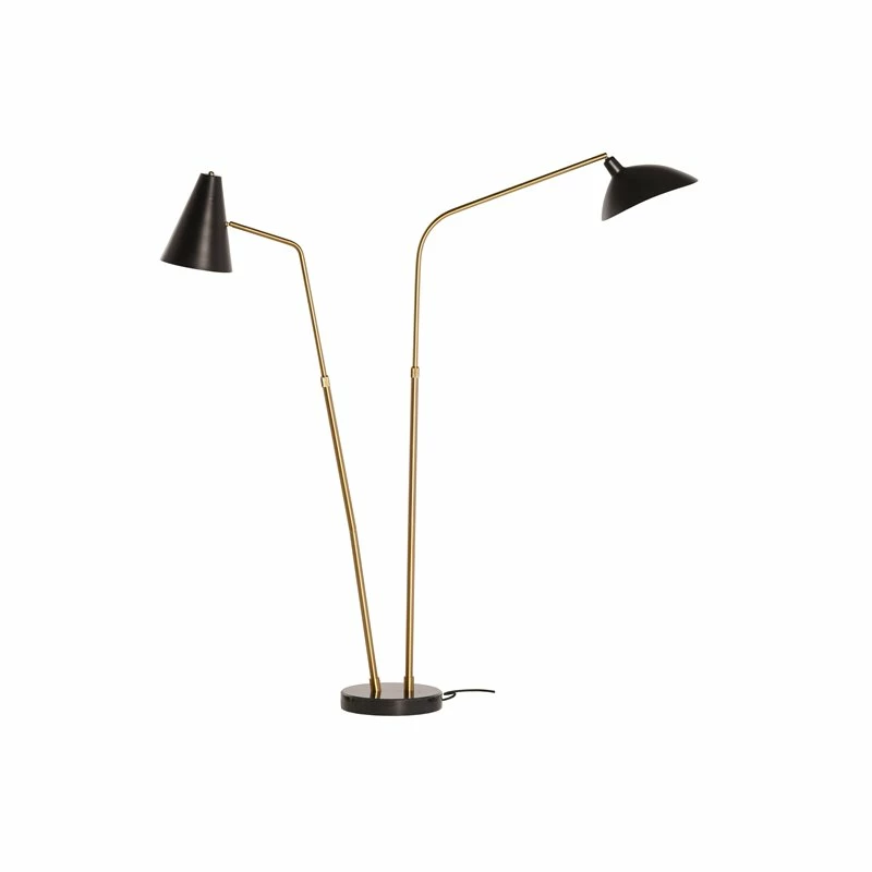 The Dominique floor light employs dual light sources, a practical design aesthetic that is both sleek and spatially functional. Stylistically contrasting polished black shades attach to brushed gold tubing and a polished black marble base, the style is both unique and elegantly urbane.