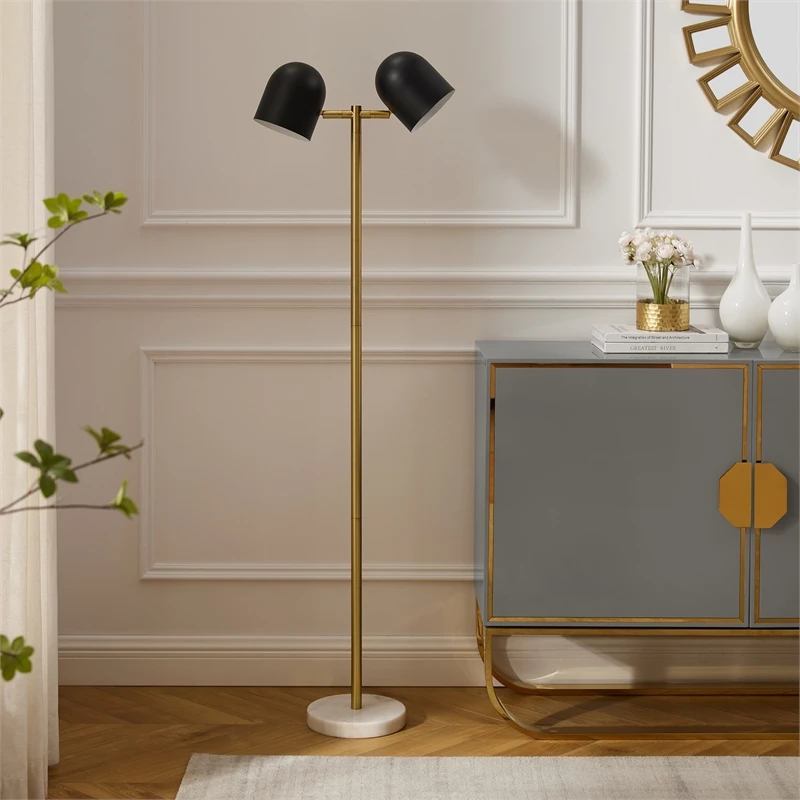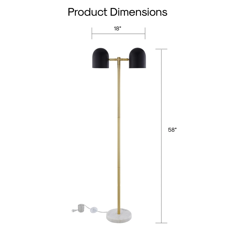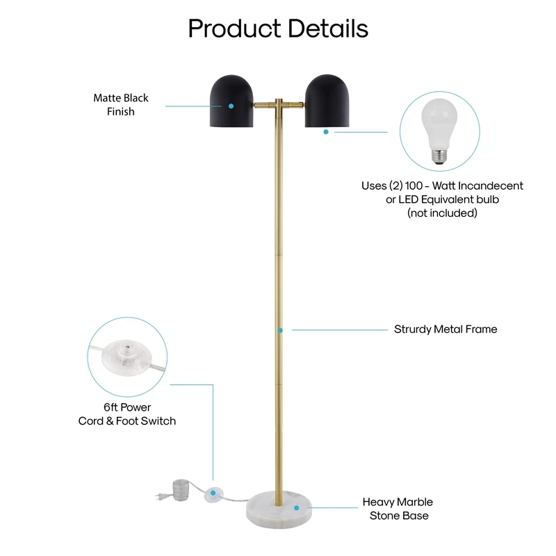 Enhance the intimacy and relaxing ambience of your home decor with this all-purpose floor lamp. This essential decor features a sturdy metal frame, supported by a polished marble base and comes with a 6-feett power cord with foot switch for easy usage. Flexible lighting is provided by two 100-watt incandescent or LED bulb equivalents. This ultra-versatile contemporary lamp piece is the perfect enhancement to any bedroom or living room lighting decor.